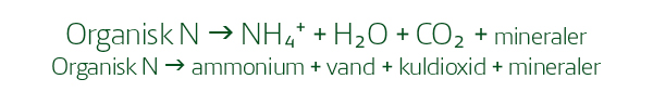 I jorden sker der forskellige processer, der omdanner kvælstof fra én kemisk form til en anden. Her nedbrydes dødt organisk materiale som planterester og husdyrgødning. Det sker ved hjælp af orme, insekter og mikroorganismer, der bruger det organiske materiale som deres føde. (Læs mere i afsnittet om jordens frugtbarhed Link til afsnittet her på siden ). Den proces hedder mineralisering, og her omsættes organisk bundet kvælstof til ammonium, NH4+, som planterne kan optage.