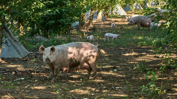 Man bruger træerne på markerne til at øge dyrevelfærd, opsamle CO2 fra atmosfæren og opsuge kvælstof fra grisenes afføring.