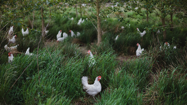 I skovlandbrug kan høns gå mellem æbletræer. Så kan man både få æg og æbler ud af produktionen - og når et æble falder ned, kan det blive spist af hønsene.