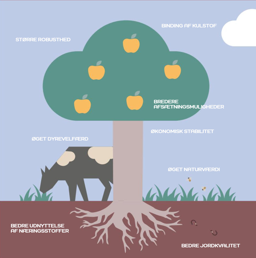 Der er stor opmærksomhed på landbrugets påvirkning af klima, natur, miljø og biodiversitet. Vi har i mange år dyrket afgrøder på markerne og holdt husdyr i stalde og på græsfolde. Det fungerer, men måske kan vi gøre tingene på en endnu smartere måde. Det kan for eksempel være ved at plante træer i markerne og på de arealer vores husdyr går på. På den måde kan man opnå flere fordele til gavn for klima, miljø, dyrevelfærd, natur og biodiversitet.