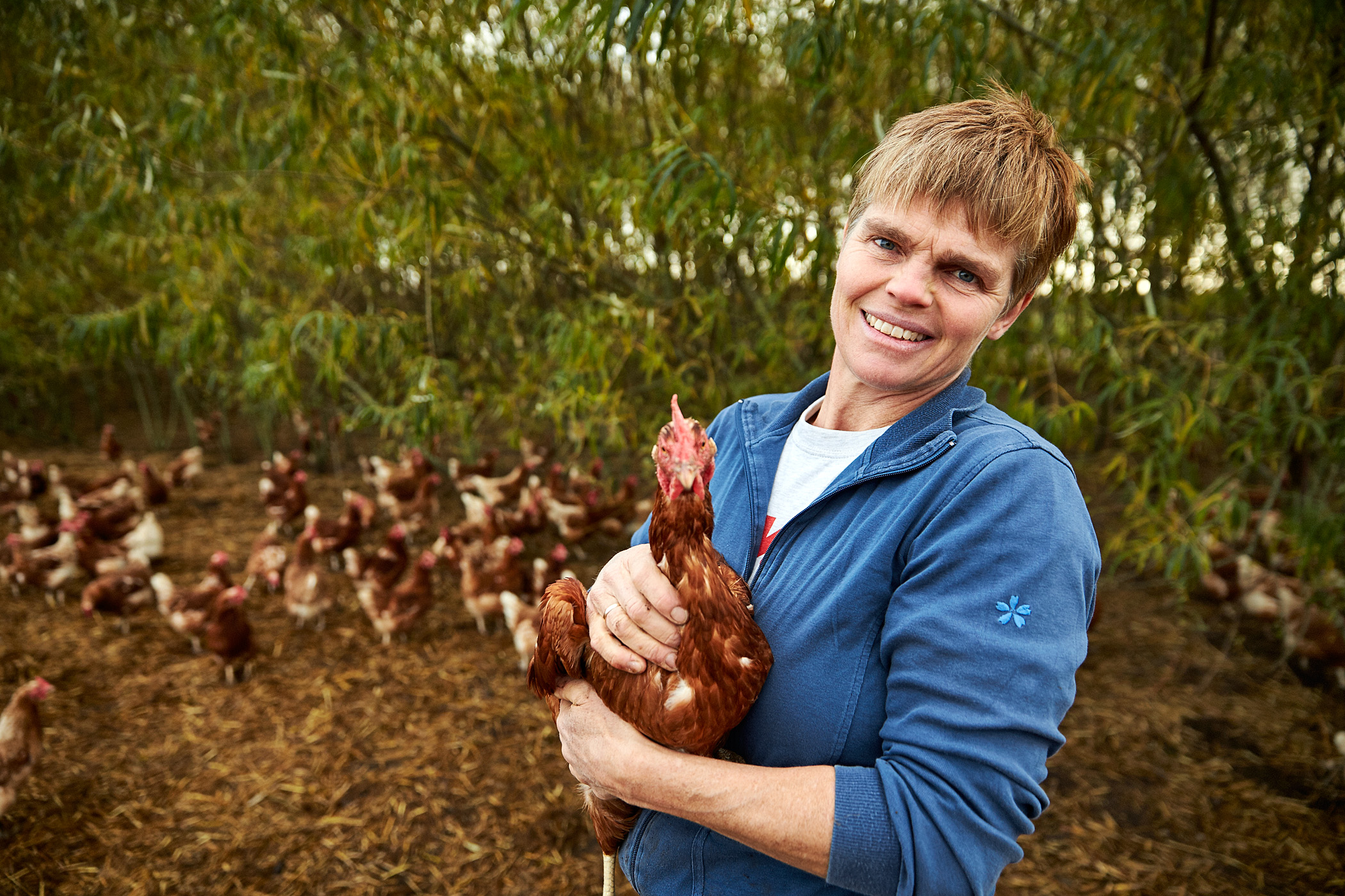 Jeg har hønerne i 12 måneder ad gangen, hvorefter jeg får nye. Kvaliteten af hønernes æg efter 12 måneder er ikke lige så god, og derfor bliver de sat ud af produktion og sendt til slagtning. I de første 14 dage skal de nye høner lære de daglige rutiner at kende. De bliver derfor holdt inde i hønsehuset indtil middagstid, indtil de lærer at lægge deres æg i hønsehuset og ikke ude blandt træerne.