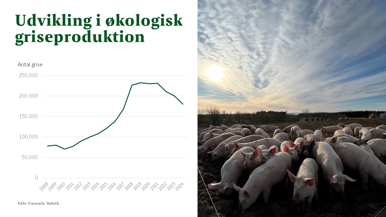 Udbuddet af økologisk grisekød er blevet tilpasset efterspørgslen og med bedre økonomi hos forbrugerne ser de økologiske griseproducenter ved indgangen til 2025 ud til at gennem en årrække. Således er produktionen af økologiske grise i Danmark vokset markant gennem de seneste 10 år. De sidste par år har udviklingen dog været stillestående og senere faldende. I 2023 blev der i alt slagtet 199.568 økologiske grise, svarende til 1,4 pct. af det samlede antal slagtninger.