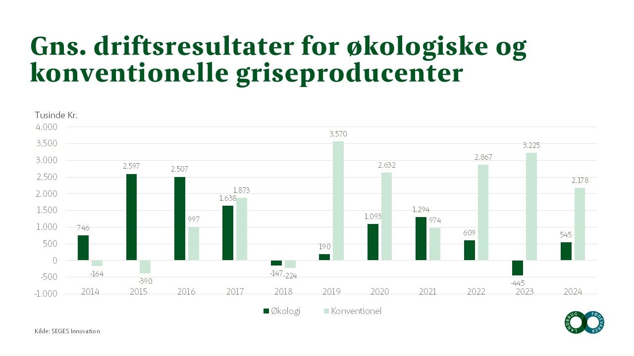 Det gennemsnitlige driftsresultat for økologiske og konventionelle griseproducenter fra 2014 til 2022.