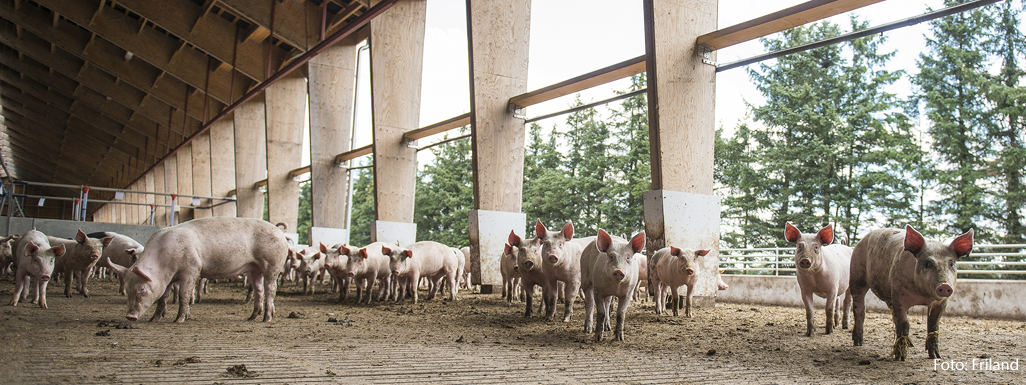 Økologiske slagtegrise holdes ofte i stalde, hvor de har god plads og rodemateriale som f.eks. halm.