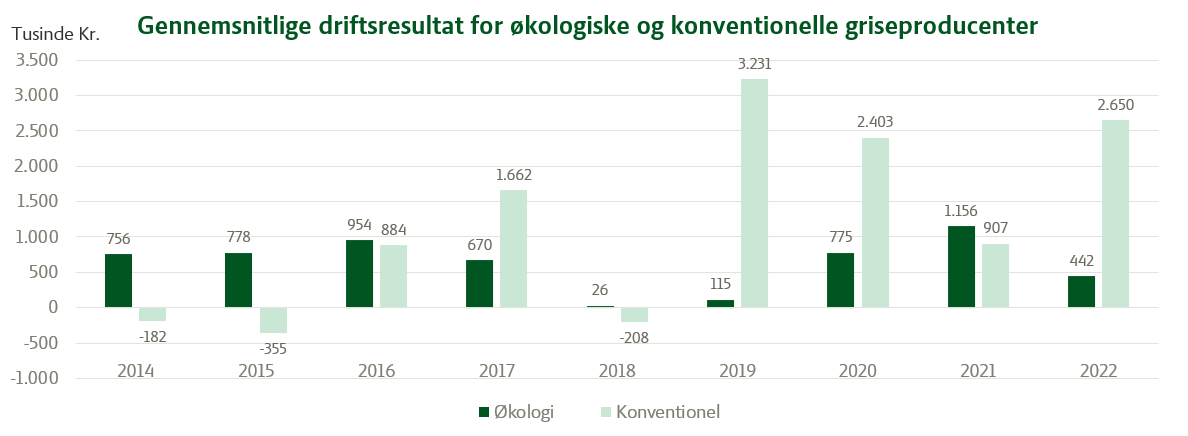 Figuren viser det gennemsnitlige driftsresultat for økologiske og konventionelle mælkeproductener gennem en årrække.